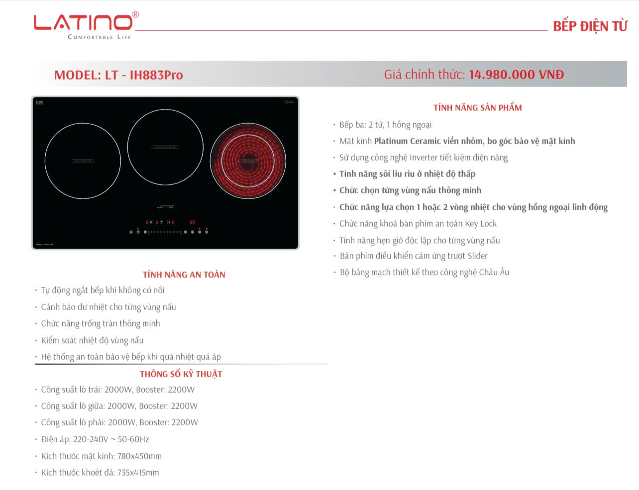 Bếp điện từ 3 vùng nấu Latino LT-IH883Pro dòng bếp từ kết hợp hồng ngoại cao cấp được sản xuất trên dây truyền công nghệ hiện đại theo tiêu chuẩn Châu Âu. Bếp sở hữu mặt kính Platinum Ceramic cao cấp được bo viền kim loại và công nghệ Inverter siêu tiết kiệm điện và nhiều tính năng nổi bật giúp điều chỉnh công suất phù hợp với kích cỡ của nồi, tự động tắt khi quá nhiệt quá áp hoặc khi xoong nồi rời vùng nấu ngăn ngừa các tai nạn bất ngờ… Giúp bữa ăn gia đình được hoàn thiện một cách nhanh chóng, tiện lợi và an toàn cho người sử dụng.