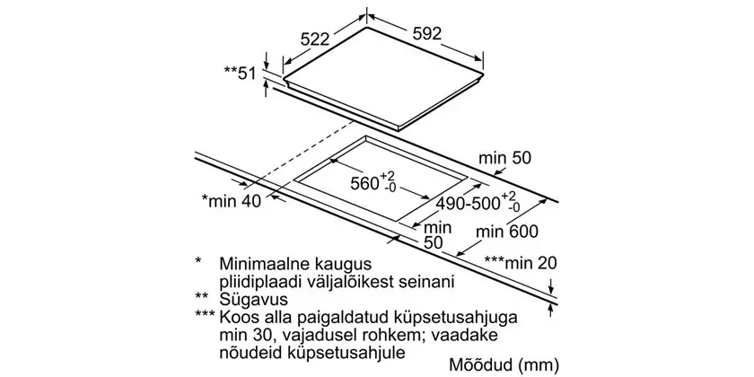 • – Kích thước bếp (C x R x S): 51 x 583 x 513 mm
