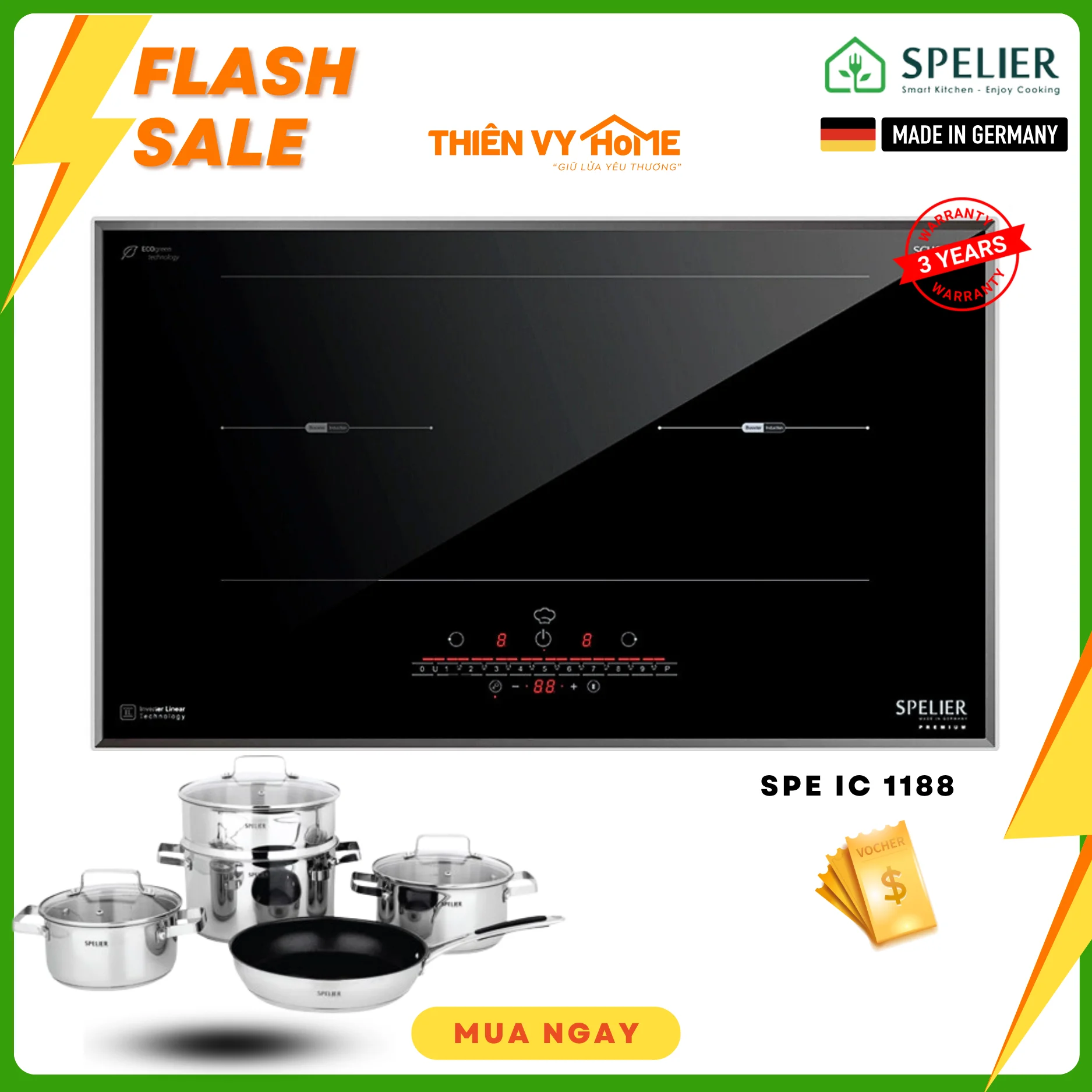 Bếp Từ Đôi Spelier SPE IC 1188 là dòng bếp từ cao cấp được sản xuất nhập khẩu từ CHLB Đức. Bếp sở hữu công nghệ Dual core inverter và nhiều tính năng nổi bật giúp điều chỉnh công suất phù hợp với kích cỡ của nồi, tự động tắt khi quá nhiệt quá áp hoặc khi xoong nồi rời vùng nấu ngăn ngừa các tai nạn bất ngờ. Ngoài ra, bếp còn được trang bị thêm các chức năng tiện ích như: Chống trào, hâm nóng…Giúp bữa ăn gia đình được hoàn thiện một cách nhanh chóng, tiện lợi và an toàn cho người sử dụng.
