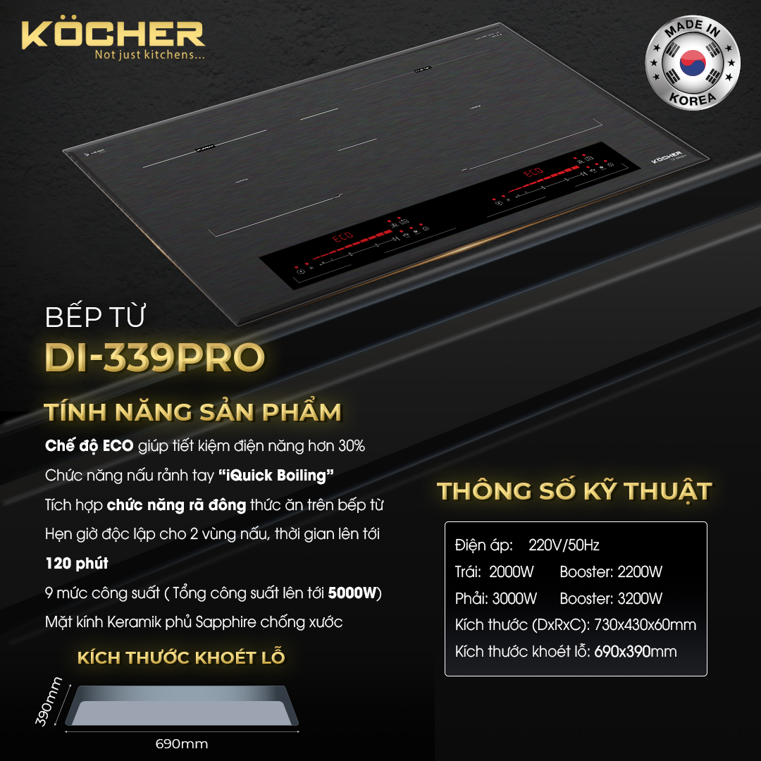 Bếp Từ Kocher DI-339PRO – Công Nghệ Big Zone Mở Rộng, Đẳng Cấp Gian Bếp Hiện Đại