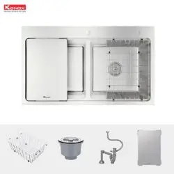 - Thiết kế hiện đại với gờ hạ bậc – tích hợp phụ kiện thông minh: Siphon, giá úp bát inox, thớt inox.
