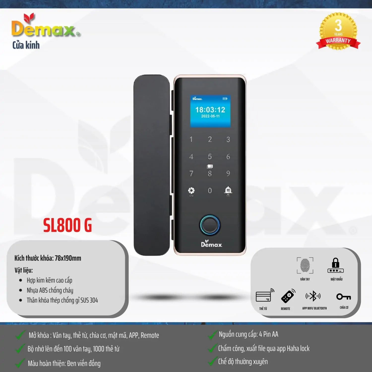 Khóa Cửa Kính Demax SL800 G là một thiết bị an ninh thông minh được hoàn thiện từ chất liệu Hợp kim kẽm cao cấp, thân khóa thép chống gỉ SUS 304 – Nhựa ABS chống cháy chịu lực vô cùng bền bỉ và chắc chắn. Được sản xuất trên dây truyền công nghệ từ Đức cho khả năng bảo mật cao cũng như nhiều tính năng mở khóa tiện lợi như mở khóa bằng: App Wifi, mật mã, vân tay, chìa cơ… Giúp bảo vệ an toàn tốt hơn cho ngôi nhà mình.