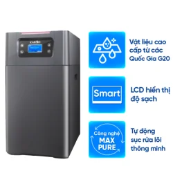 Màn hình LCD hiện đại cùng phím cảm ứng, hiển thị các thông tin về khối lượng nước thành phẩm; lưu lượng nước đang lọc; thời điểm sục rửa, hoàn nguyên trong ngày cùng 6 chế độ vận hành của máy.