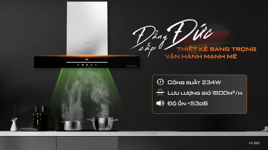 Trang bị động cơ mạnh mẽ 1600 m³/h, Junger H-90 dễ dàng hút sạch hơi nóng, dầu mỡ và mùi thức ăn trong thời gian ngắn, giúp không gian bếp luôn khô thoáng, sạch mùi.