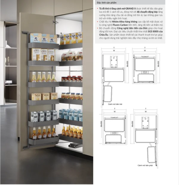 Tủ đồ khô cánh mở Grand X Titanium XPR.600T là một thiết bị phụ kiện thông minh dành cho tủ bếp hiện đại, sản xuất trên dây truyền công nghệ Châu Âu. Giúp cho tủ bếp nhà bạn tiết kiệm được nhiều không gian để đồ hơn, đồ dùng được sắp xếp một cách khoa học, gọn gàng và ngăn nắp hơn.
