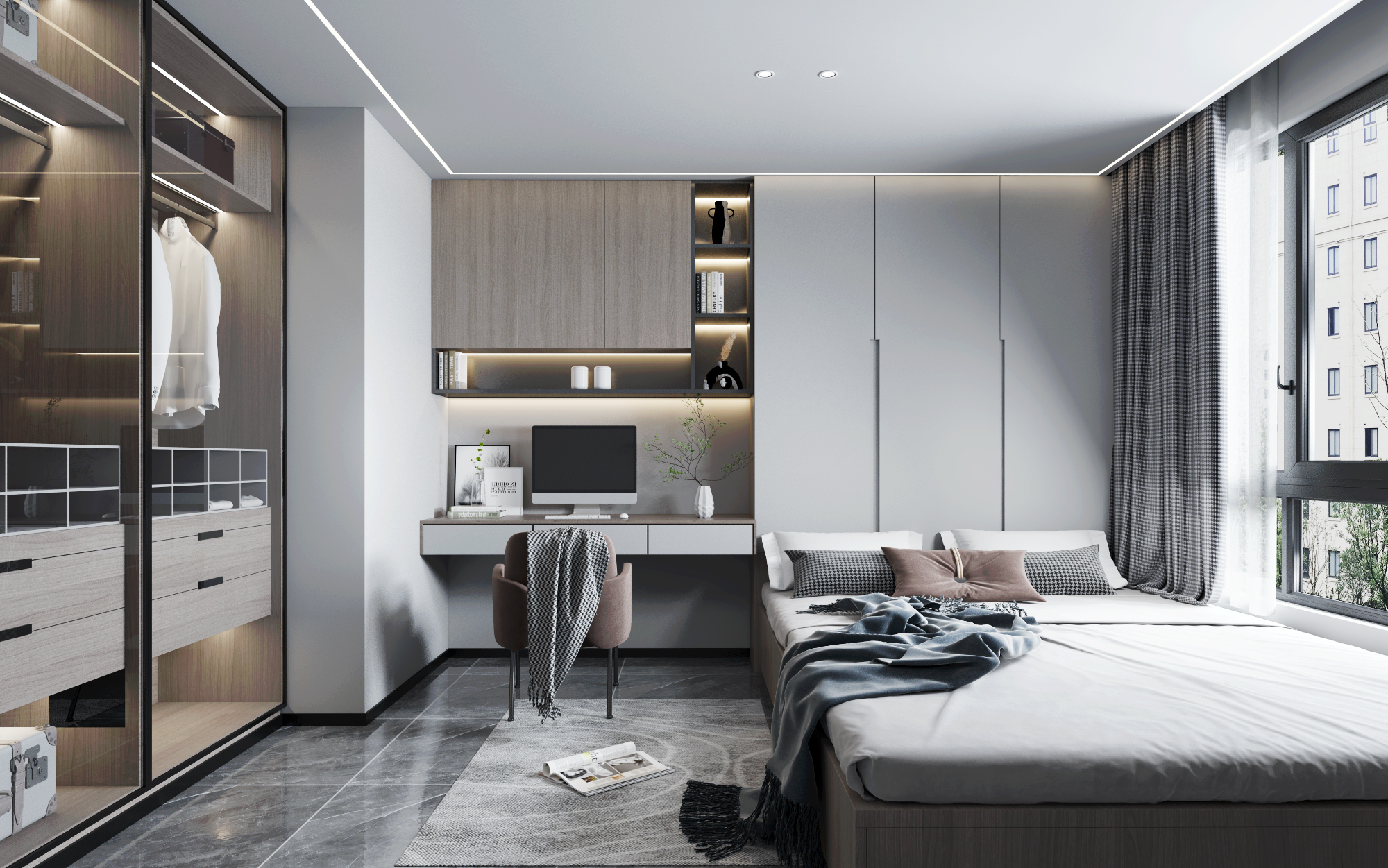 Tủ quần áo âm tường, giường ngủ gỗ công nghiệp, bàn trang điểm đồng bộ – tối ưu không gian, tinh tế trong từng chi tiết.