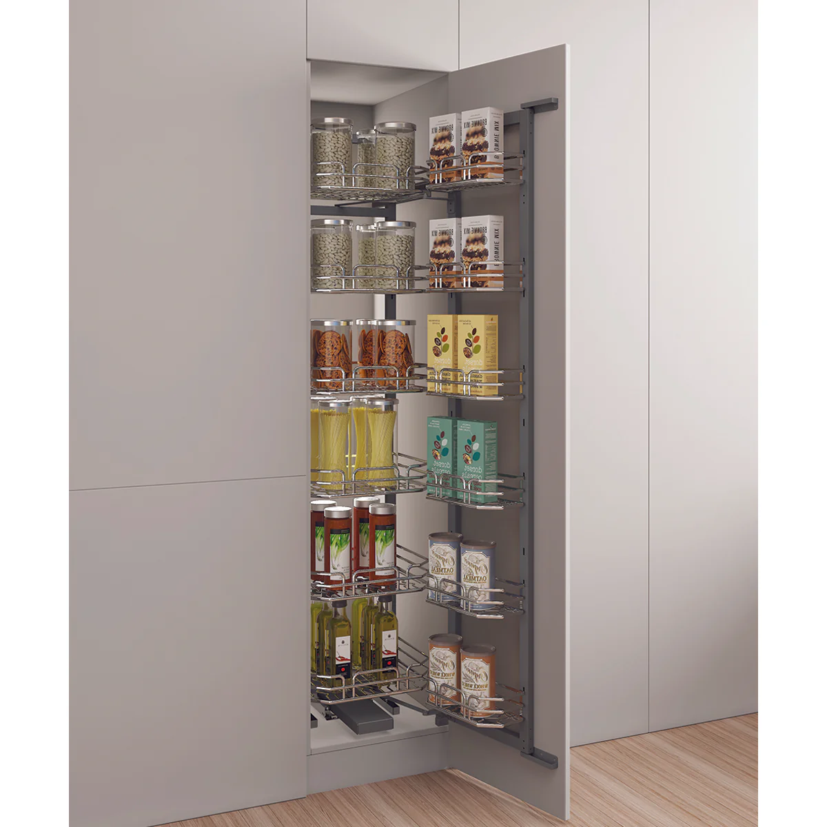 Nhờ thiết kế nhiều tầng (5–12 tầng tùy mẫu), tủ kho Hafele giúp bếp gọn gàng, tối ưu diện tích và giảm tối đa tình trạng bừa bộn.